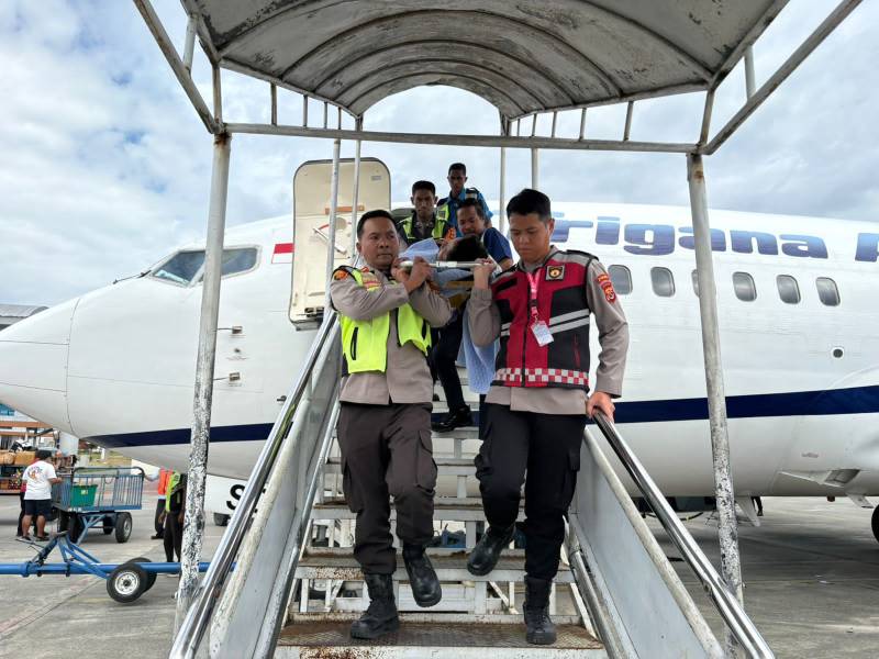 Setibanya di landasan pacu, korban langsung dipindahkan ke ambulans milik RS Bhayangkara yang telah disiagakan di area bandara.